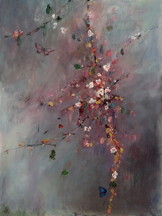 “Butterfly Vines” expands Andy Bahk’s visual language into a more immersive composition. The work blends organic movement with layered forms, suggesting growth, entanglement, and transformation. Its larger scale allows the gestural energy to fully unfold, creating a dynamic visual field rooted in natural symbolism.