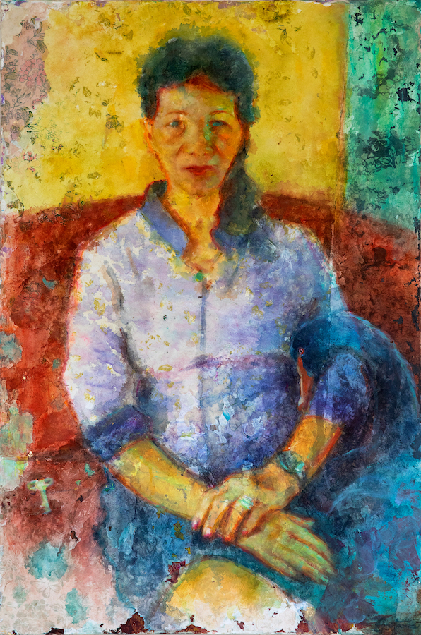 “Ruth” is a 2025 mixed media painting by Constance Brantley, created with acrylic, paper, oil stick, and gold leaf on canvas. Part of the Neo-Emotionalism Group Exhibition, this work explores themes of identity, reverence, and emotional depth through rich textures and luminous detail.