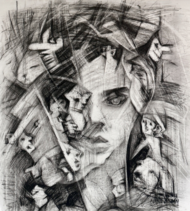 “States of Emergence” is a 2026 charcoal on paper drawing by Nida Amin. The work explores transformation and becoming through layered mark-making and tonal depth, suggesting forms that appear and dissolve within the surface. The composition emphasizes process and movement, capturing a sense of gradual revelation and shifting identity.