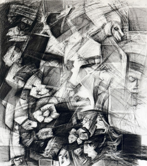 “Unfixed” is a 2026 charcoal on paper drawing by Nida Amin. The work explores instability and fluid identity through gestural mark-making and shifting tonal fields. Forms appear in flux, resisting definition and suggesting a continuous state of change, where structure dissolves into movement and ambiguity.