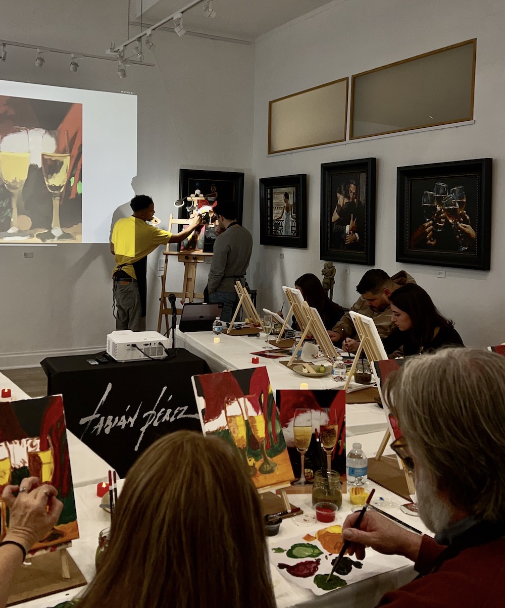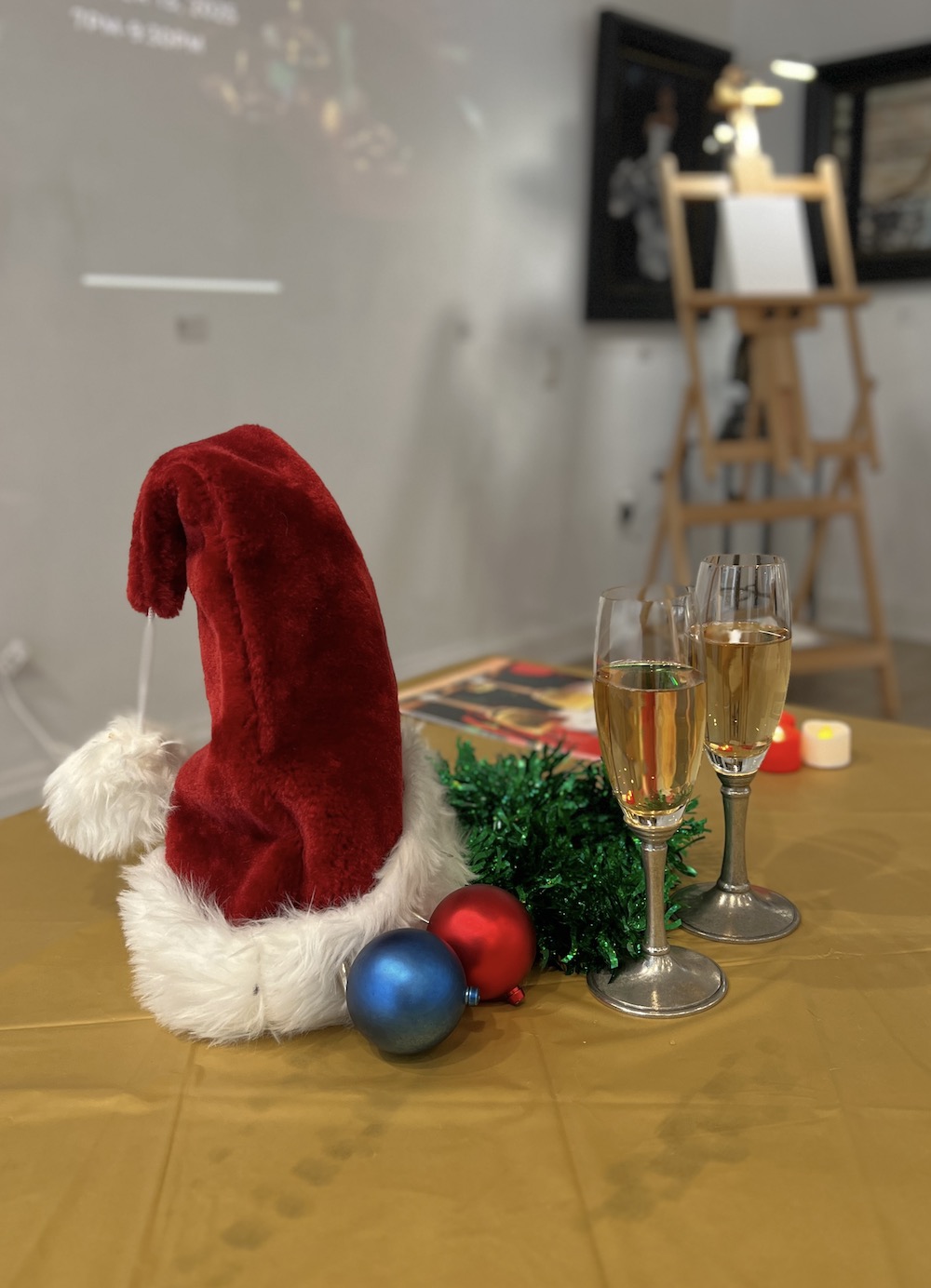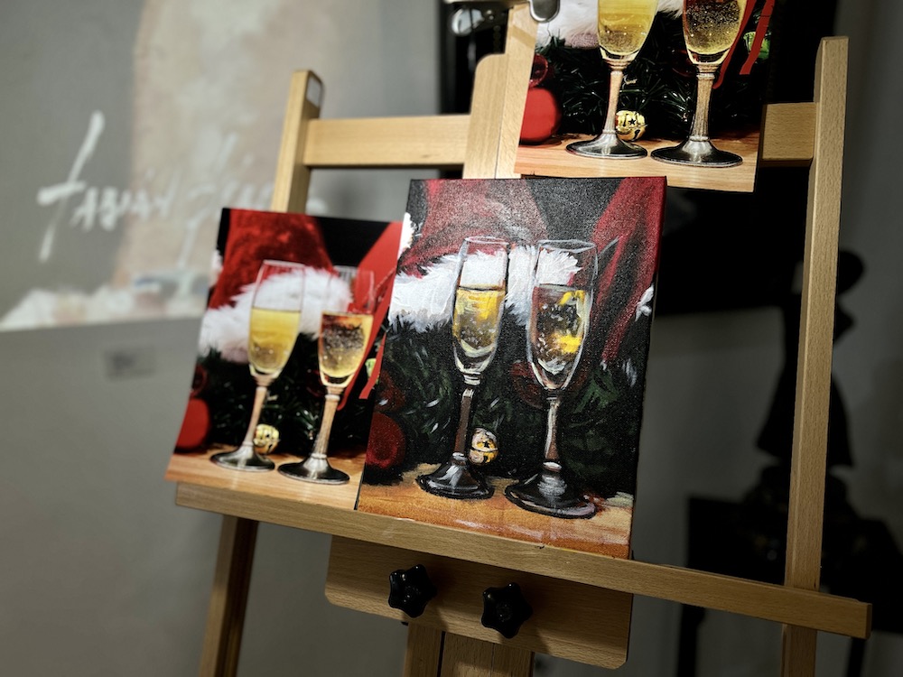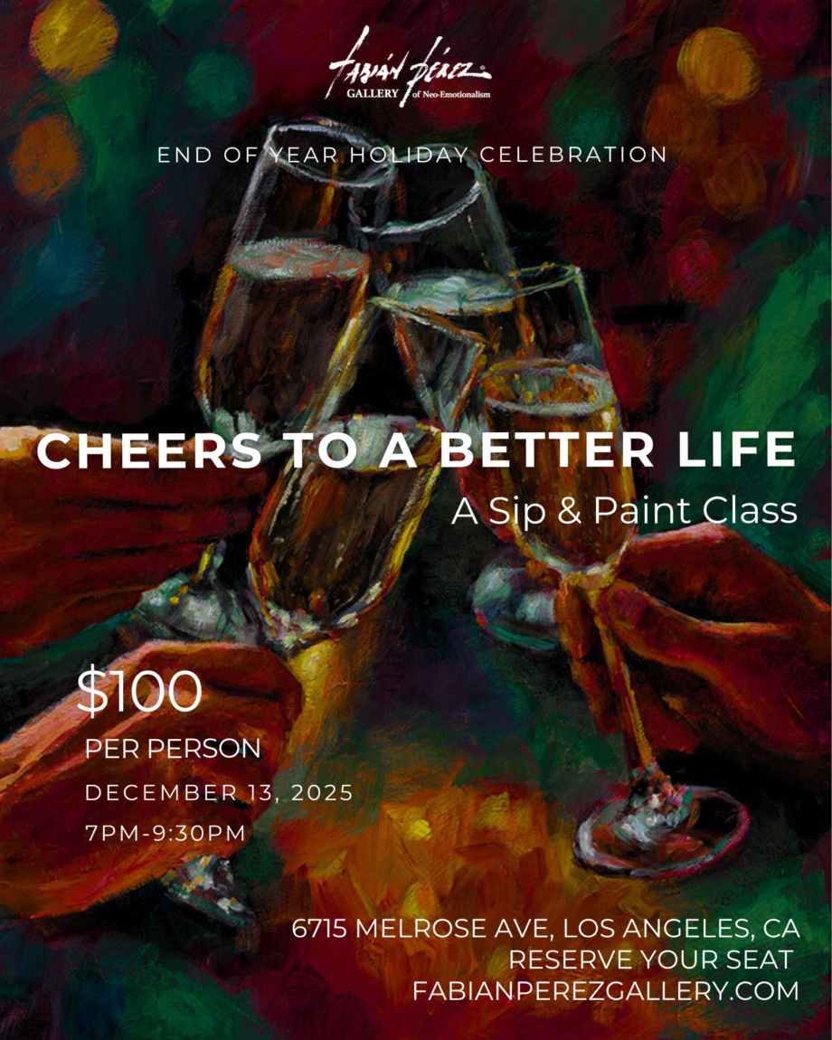 Thank you for attending our Cheers to A Better Life Sip and Paint Class at Fabian Perez Gallery of Neo-Emotionalism on December 13th, 2025. We painted an observational setup of a Holiday Hat along with Champagne Glasses inspired by Fabian Perez’s Wine and Spirits Collection.